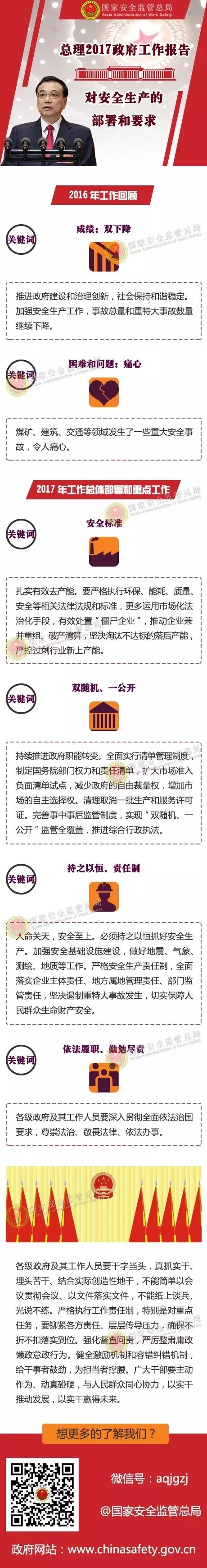 報告中,關于安全生產工作,總理在回顧2016年工作時總結了成績指出了不足,在2017年工作總體部署和重點工作任務中,明確了安全生產的任務要求,尤其強調安全生產責任制的落實。政府工作報告中對于供給側改革、轉變政府職能等部署,也同時對加強安全生產法規標準、轉變政府安全生產監管方式和作風等提出了要求。