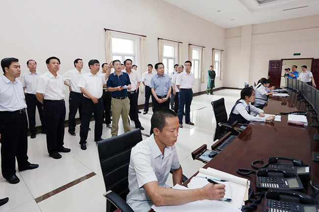 6月22日上午,國家安全監管總局黨組副書記、副局長付建華在京煤集團昊華能源公司大臺煤礦調度指揮指揮中心了解防汛安全工作情況。