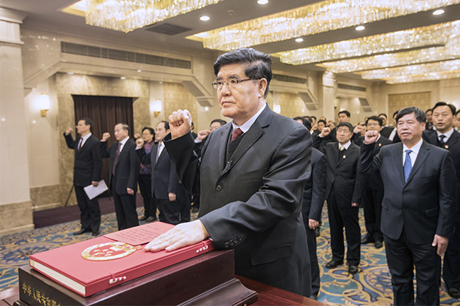 宣誓現場氣氛莊重,國徽高懸、國旗鮮艷,宣誓臺上擺放著《中華人民共和國憲法》。17時30分,宣誓儀式開始。全體起立,同唱中華人民共和國國歌。領誓人左手撫按憲法,右手舉拳,宣讀誓詞。其他宣誓人列隊站立,跟誦誓詞。