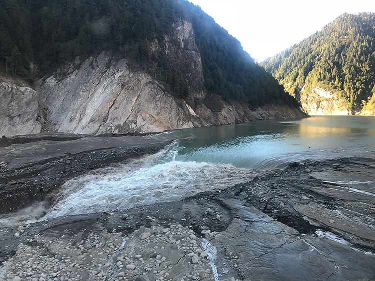 10月31日上午,應急管理部牽頭的部際聯合工作組組織地質、水利、冰川、測繪等專家乘坐西藏軍區某陸航旅直升機前往雅魯藏布江堰塞體及周邊現場考察。觀察發現,9時30分雅魯藏布江堰塞體出現自然過流。截至9時30分,堰塞體蓄水量約為3.2億立方米。
