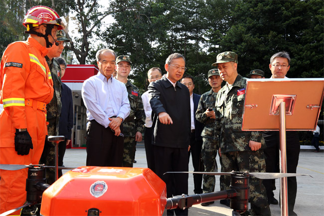 云南是全國林業第二大省,地震災害形勢突出,許多領域的災害救援在全國具有典型代表意義。黃明先后來到南方航空護林總站、昆明市消防支隊、昆明基準地震臺和減隔震實驗室、森林消防局直升機支隊飛行二大隊,看望慰問一線工作人員和消防指戰員,檢查應急救援科目訓練,實地查看設備運轉和裝備保障情況,并分別在云南省應急管理廳、消防總隊、森林消防總隊等單位召開座談會。黃明要求,主動汲取美國加州森林大火教訓,針對南方林區特點,提前做好預警、預測、預防工作,預設戰場綜合演練,在實戰中發現問題、解決問題,確保林業安全、生態安全。要加強震害防御,提高地震臺網監測能力,高效有序做好地震應急處置工作,形成一套符合云南特點的防災減災救災做法。