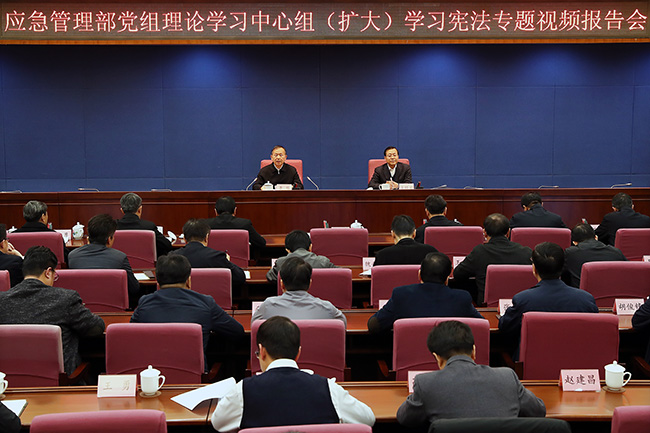12月7日,應急管理部黨組書記黃明主持召開黨組理論學習中心組(擴大)學習視頻報告會,專題學習憲法,強調要深入學習貫徹習近平總書記關于憲法的重要論述,深刻領會和全面掌握憲法修正案的核心要義和精神實質,弘揚憲法精神,樹立憲法權威,提高運用法治思維和法治方式解決問題的能力和水平,扎實做好新時代應急管理工作。