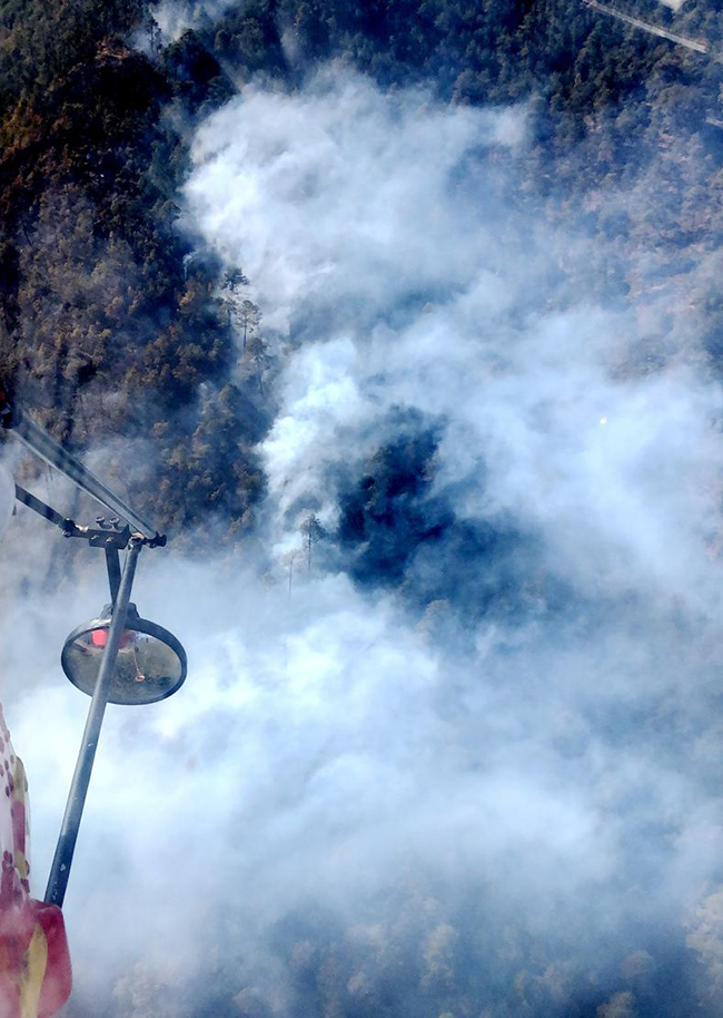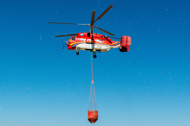 28日8時許,天剛一亮,鹽源基地K-32直升機騰空而起,徑直飛赴火場,迅速投入撲火戰斗。10時許,隨著巨大轟鳴聲響徹云霄,世界上最大的M-26直升機從西昌青山機場起飛,飛越崇山峻嶺,長途奔襲150公里,迅速加入到撲火戰斗中。直升機飛抵火場時,發現大片森林正在猛烈燃燒,火場上空濃煙滾滾、火星四射,火勢蔓延迅速,有失去控制的危險,這對開展航空滅火是個極大的考驗。在飛行觀察員的精心指揮下,兩個飛行機組沒有絲毫畏懼和退縮,牢牢把住飛行操作桿,憑著高超的飛行技術,沉著應對高原對流強、氣流紊亂等困難,在距火場約13公里的瀘沽湖反復吊水滅火,隨著一桶又一桶湖水傾天而下,在天空中劃出一道道美麗的弧線,火勢一點點減弱下去。經過一天與火魔的反復拉鋸,激烈爭奪,火場中威脅成片林區的北部、東北部火頭、火線終于低下她那高傲而不可一世的頭顱,被威武剛強的鐵膽雄鷹死死扼制在安全范圍內,到傍晚直升機返航時,整個火場只余零星火點、煙點。