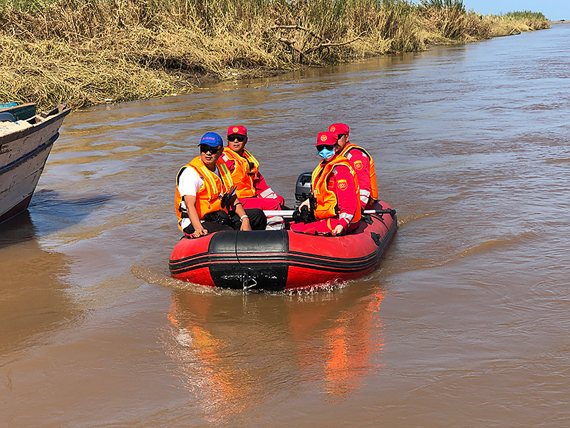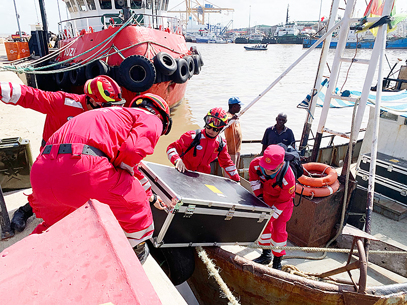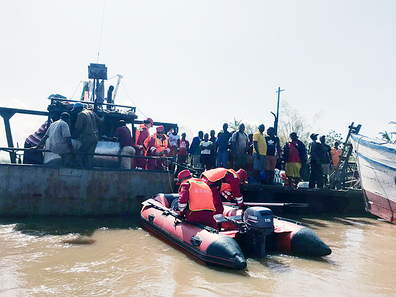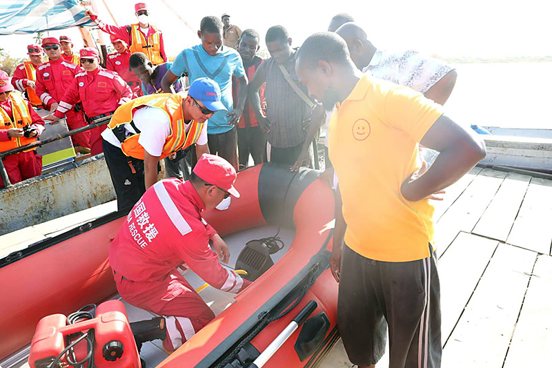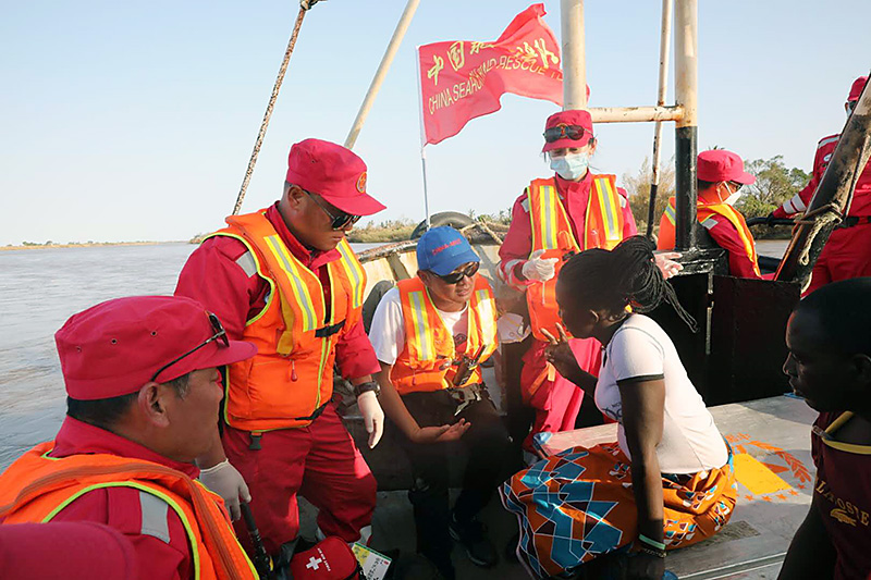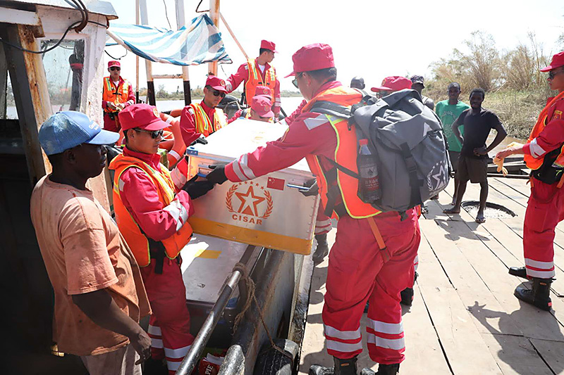 3月28日,中國救援隊跨海實施救援行動。抵達重災區buzi(部滋)碼頭后,利用舟艇對斷路村莊進行偵察,并向當地捐贈了橡皮艇和食品物資。同時,受當地政府委托,將六名傷員運送回貝拉市。圖片資料由中國救援隊提供