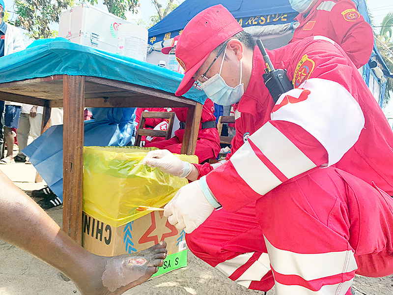 中國救援隊外科專家給腳部嚴重潰爛感染的災民清創消毒包扎。圖片資料由中國救援隊提供