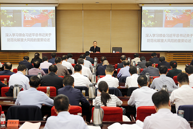 黃明在輔導報告中強調,黨的十八大以來,以習近平同志為核心的黨中央高度重視防范化解重大風險,習近平總書記發表了一系列重要講話,提出一系列新理念新舉措新要求,深刻闡述了著力防范化解重大風險的一系列重大理論和實踐問題。習總書記重要論述,體現了中國共產黨人的初心使命,體現了對治國理政的精準把握,體現了對世情國情黨情的深刻洞察,是駕馭中國航船劈波斬浪、行穩致遠的關鍵之策,是保持經濟持續健康發展和社會大局穩定十分管用和十分必要的一招,更是我們黨戰勝各種風險挑戰、不斷從勝利走向勝利的重要思想方法、工作方法、領導方法。我們要深入學習領會,增強“四個意識”,堅定“四個自信”,做到“兩個維護”,進一步增強防范化解重大風險的政治自覺和責任擔當。