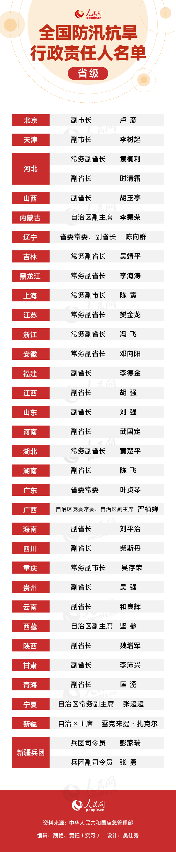 人民網北京6月2日電(記者魏艷 實習生黃鈺)國家防汛抗旱總指揮部近日通報了2019全國防汛抗旱行政責任人名單。記者梳理發現,31個省市區的省級責任人名單中包含正省級1名、副省級31名。另有新疆建設兵團司令員、副司令員各一名。