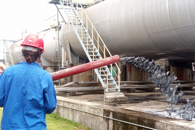 檢查組在企業現場檢查了消防應急演練情況。伴隨著一股惡臭,檢查組看到的是一股黑色液體從一個消防泡沫炮里流出,這和旁邊可以正常使用的消防泡沫炮形成了“一黑一白”的鮮明對比。據專家介紹,正常的消防泡沫炮噴出的水遠看應該是白色水柱,消防泡沫炮的水壓不夠,才會出現水流出來而不能噴射水柱的情況。對于流出液體為黑色,企業的解釋是因為平時沒有演練,但專家當場否定。專家認為就算沒有使用過,消防泡沫炮內壁生銹,噴出的水也應當是黃色的,液體為黑色應當與消防水池長期未清洗有關。