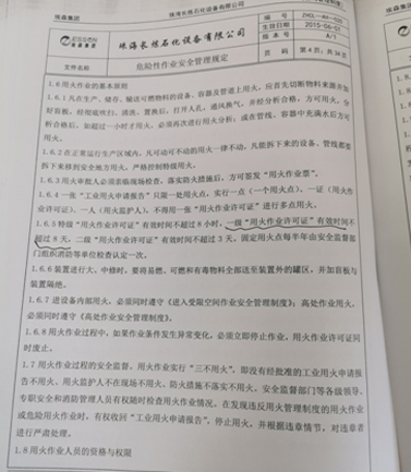檢查組專家在查看該公司相關資料時,發現該公司危險性作業安全管理規定中的用火作業基本原則竟然出現重大失誤。文件中規定一級用火作業許可證有效時間不超過8天,但這與《化學品生產單位特殊作業安全規范》里所規定的“一級用火作業許可證有效時間不超過8小時”嚴重不符。