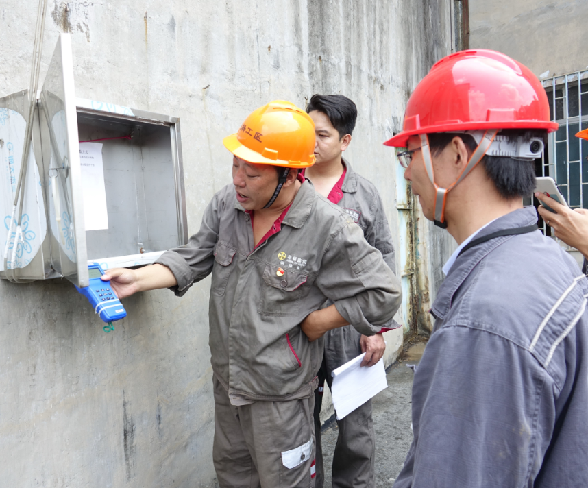 廣西華錫集團股份有限公司銅坑礦工作人員(左一)向檢查組介紹3號風機房風機的風速。 李青山 攝
