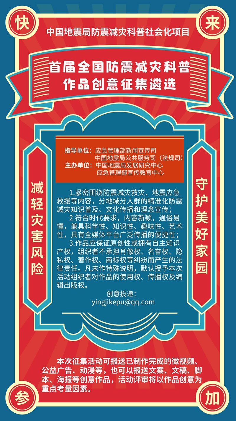 我國是世界上地震災害最為嚴重的國家之一,地震多、強度大、分布廣、災害重是我國的基本國情,一旦發生重特大地震災害,可能會對人民生命財產安全造成重大損失。地震是一種自然現象,地震災害無法避免,但是,我們可以通過提升人們的防震減災意識和應急避險、自救互救能力來降低風險和減輕損失。一句提示、一張海報、一個短視頻,就有可能拯救生命。聽上去是不是很酷?那就加入我們吧,你提創意,我來傳播,你我一起,讓家園更加美好!