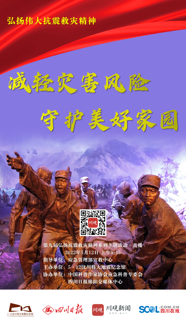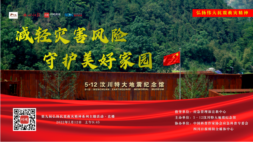 本次直播由應急管理部宣教中心指導,由5·12汶川特大地震紀念館主辦,中國科普作家協會應急科普專委會和四川日報綿陽全媒體中心協辦。屆時,川觀新聞記者將用鏡頭帶你沉浸式參觀5·12汶川特大地震紀念館,一起重溫抗震救災的英雄壯舉,一起見證災后重建的波瀾壯闊,一起學習防災減災的實用知識。